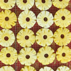 Nhằm giúp trái khóm đi xa hơn, đến tay nhiều khách hàng hơn HTX đã đầu tư hệ thống sấy đạt tiêu chuẩn quốc tế để ra đời sản phẩm Khóm sấy Đông Din. Những tiêu chuẩn còn lại sau khi thu hoạch sẽ được rửa sạch và tứ xử lý khí Ozon để bảo đảm loại bỏ tạp chất và vi khuẩn gây hại. Sau đó, chúng tôi sẽ được gọt sạch, lắt mắt, bỏ cùi. Tiếp theo trái khóm sẽ được đưa vào máy cắt khoanh, rồi ngâm trong muối nước dịch. Từng khoanh sau đó sẽ được thu dọn, để làm khô nước và tiến hành sấy lạnh trong khoảng thời gian lên đến 72h đồng hồ. Sấy khô mức độ đã được kiểm tra và tính toán sao cho sản phẩm giữ lại nguồn dưỡng chất quý giá như các loại Vitamin A, B, C, các loại chất như canxi, photpho, mangan và chất chống oxy hóa Bromelai có trong trái khóm tươi.